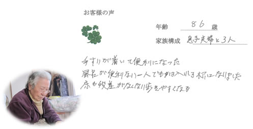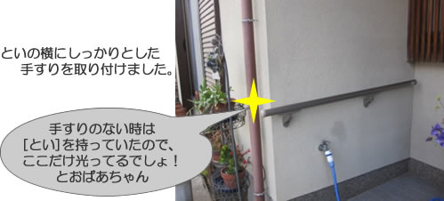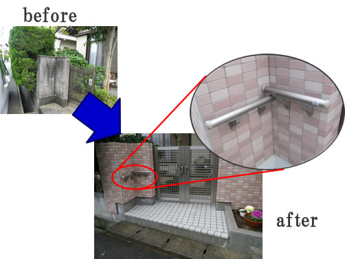 高齢のため、玄関の段差が不便でしたので、上り下りしやすい様、手すりを取り付けいたしました。