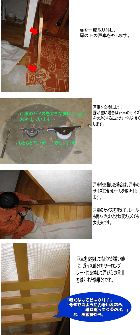 この場合、戸車とレールを交換するだけで信じられないくらい扉がかる~く開閉できますよ!